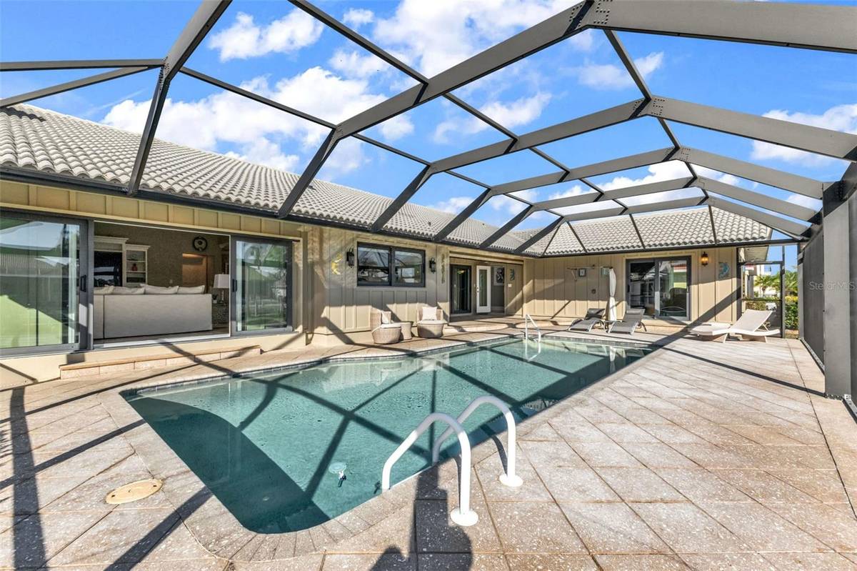 The primary suite is a true retreat, offering an expansive layout, custom mirrored built-ins, DUAL WALK-IN CLOSETS, and a SPA-INSPIRED master bath with dual vanities and a luxurious walk-through shower. Guests will enjoy their own private suite with a modern bath, while a third bedroom (currently an office/den) provides a SPECTACULAR VIEW OF CHARLOTTE HARBOR and direct access to the lanai and pool area.