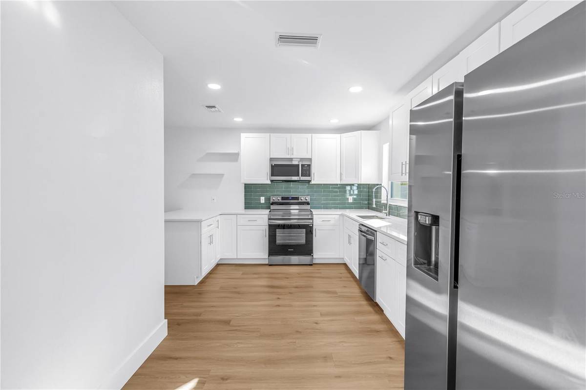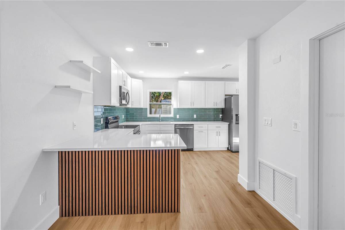 Less than a mile away from downtown Gulfport and the arts district. Enjoy morning walks to the waterfront, afternoons exploring local galleries and boutiques, and evenings spent at your favorite café or wine bar, all just minutes from the Gulfport marina as well for boat enthusiasts. As you arrive you'll notice the oversized driveway and freshly painted exterior. This home also offers underground utilities (electric). This charming, move-in-ready home has been thoughtfully updated to match its vibrant surroundings. Inside, freshly painted walls, luxury vinyl flooring flows throughout, offering a warm, coastal/natural feel with modern durability. The kitchen features white shaker cabinets, quartz countertops, Samsung stainless steel appliances and a gorgeous green backsplash that adds personality and style.